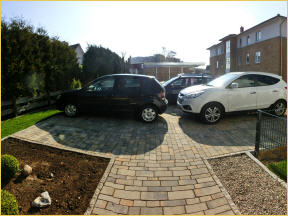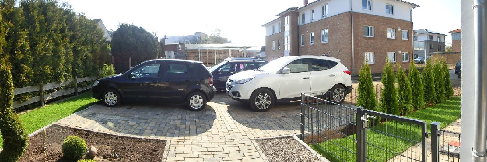 Zwei hintereinander angeordnete PKW-Stellplätze befinden sich am Ferienhaus (verlängerte Stellfläche). Die gepflastere Fläche hat eine Länge von 9,70 Metern. Dazu kommen als Verlängerung rd. 2 Meter Rasengittersteinfläche.