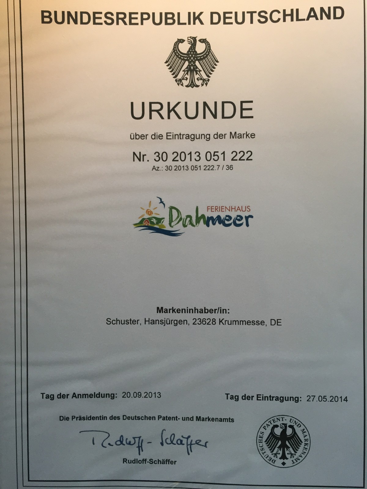 Nach langer Suche und vielen Überlegungen haben wir uns als Namen für das Ferienhaus für Dahmeer entschieden. Dieses Kunstwort ergibt sich aus dem Ort Dahme und dem Meer. Inzwischen sind Logo und Wort rechtlich als Marke geschützt.
